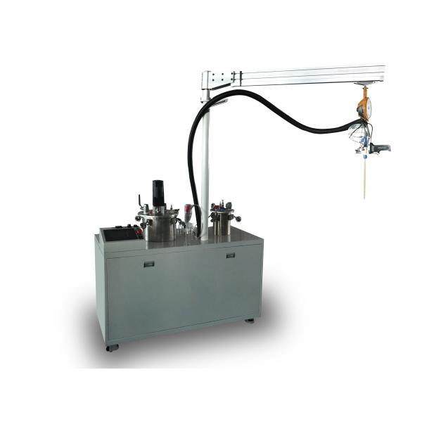 Compound materials A & B are kept in two tanks separately. There are two sets of metering pumps inside the machine for metering A and B resin by setting ratio, draining out material individually from tank A & B. Liquid A & B mix with each other in the mixer pipe and dispensed out according to the programmable data.